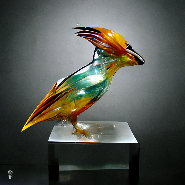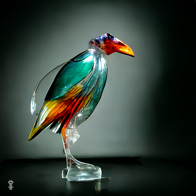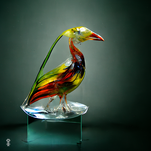 Glass is probably my most favorite material. I have always loved mainly colored translucent pieces. Therefore one of the first things I did as an experiment/project/research with AI was things from glass. First, there were horses, and now a series of exotic birds.