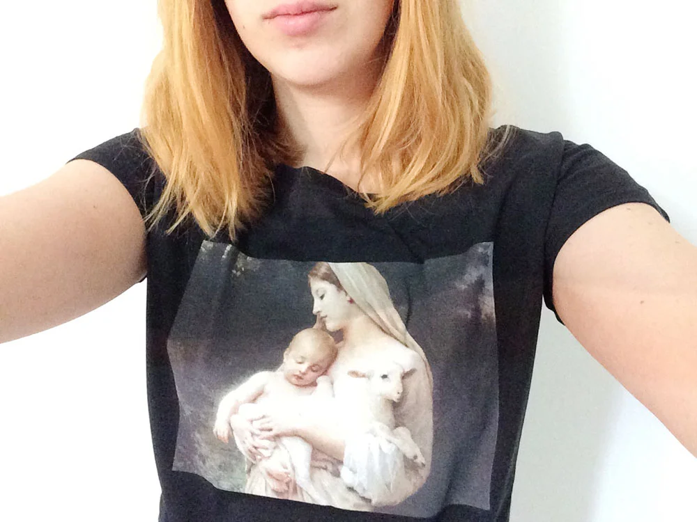 tA tak som si z tohto diela skúsila urobiť tričko. Aby som bola úprimná, chcela som ho vo verzii dvoch Márií zrkadlovo k sebe otočených vylepiť v obývačke na stenu aspoň 2x2m, ale už tam je medzičasom obraz od mladého slovenského maliara : ).