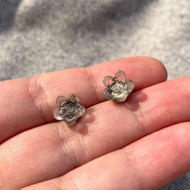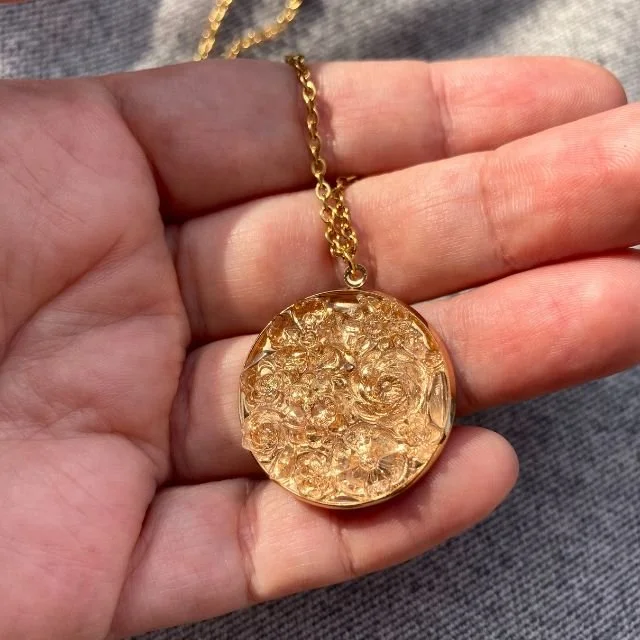 Fragile blossoms encased in resin, embraced by metal like sunlight around petals. Together they form eternal bouquets. Gentle, timeless, alive in their stillness.